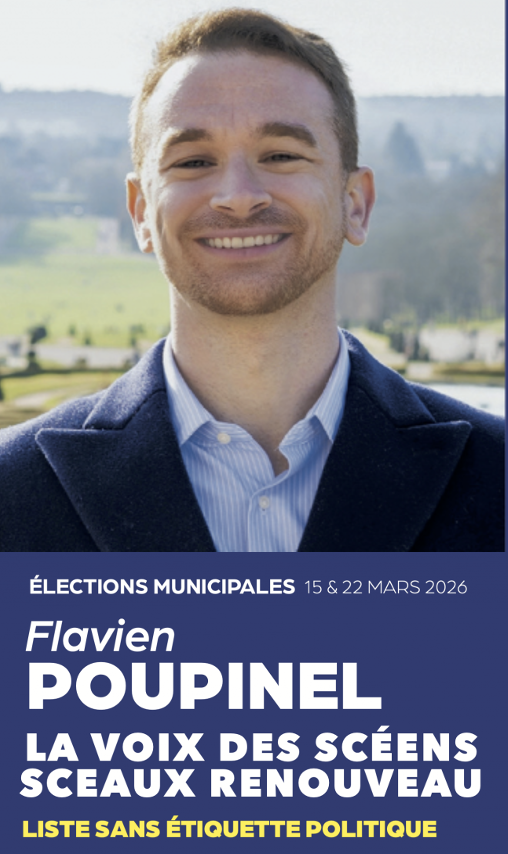 Le tout nouveau président de l’association « La voix des Scéens » s’est aussi lancé dans la bataille pour la mairie de Sceaux. Son portrait géant et son nom, Flavien Poupinel, s’affichent en ville, parfois recouverts d’une mention anonyme indiquant qu’il n’habite pas Sceaux. Une plaquette luxueuse de 18 pages, digne d’un document publicitaire, a présenté une ribambelle d’annonces se voulant « de bon sens ». Les propositions, pleines de belles promesses parfaitement électoralistes, appellent à recentrer les dépenses sur la sécurité, la voirie, les espaces verts. Des promesses pas chiffrées et pas finançables dès lors qu’il veut en priorité limiter les impôts et rembourser la dette.