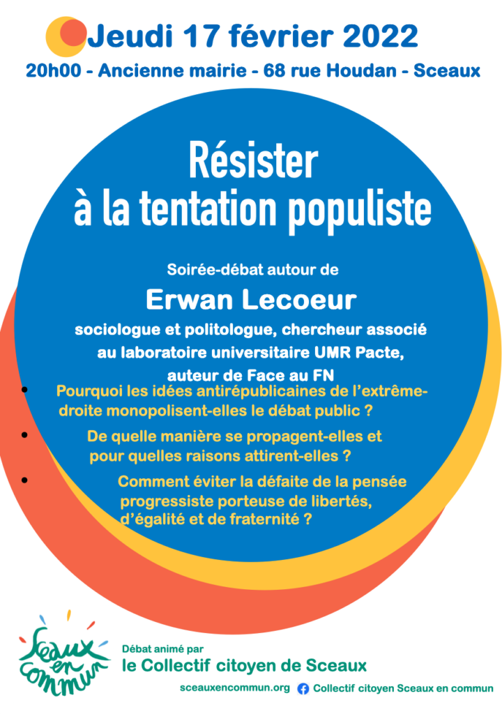Jeudi 17 février 2022 – Ancienne mairie –Résister à la tentation populiste. Soirée débat autour de Erwan Lecoeur, sociologue et politologue, chercheur associé au laboratoire universitaire UMR Pacte, auteur de Face au FN. Retrouvez le compte rendu de ces deux heures d’échanges qui ont passionné le public venu en nombre. Une analyse sociologique captivante, un décryptage pertinent de la situation politique, un débat stimulant autour d’Erwan Lecoeur, une invitation à ne pas baisser les bras et à agir, notamment au niveau local.